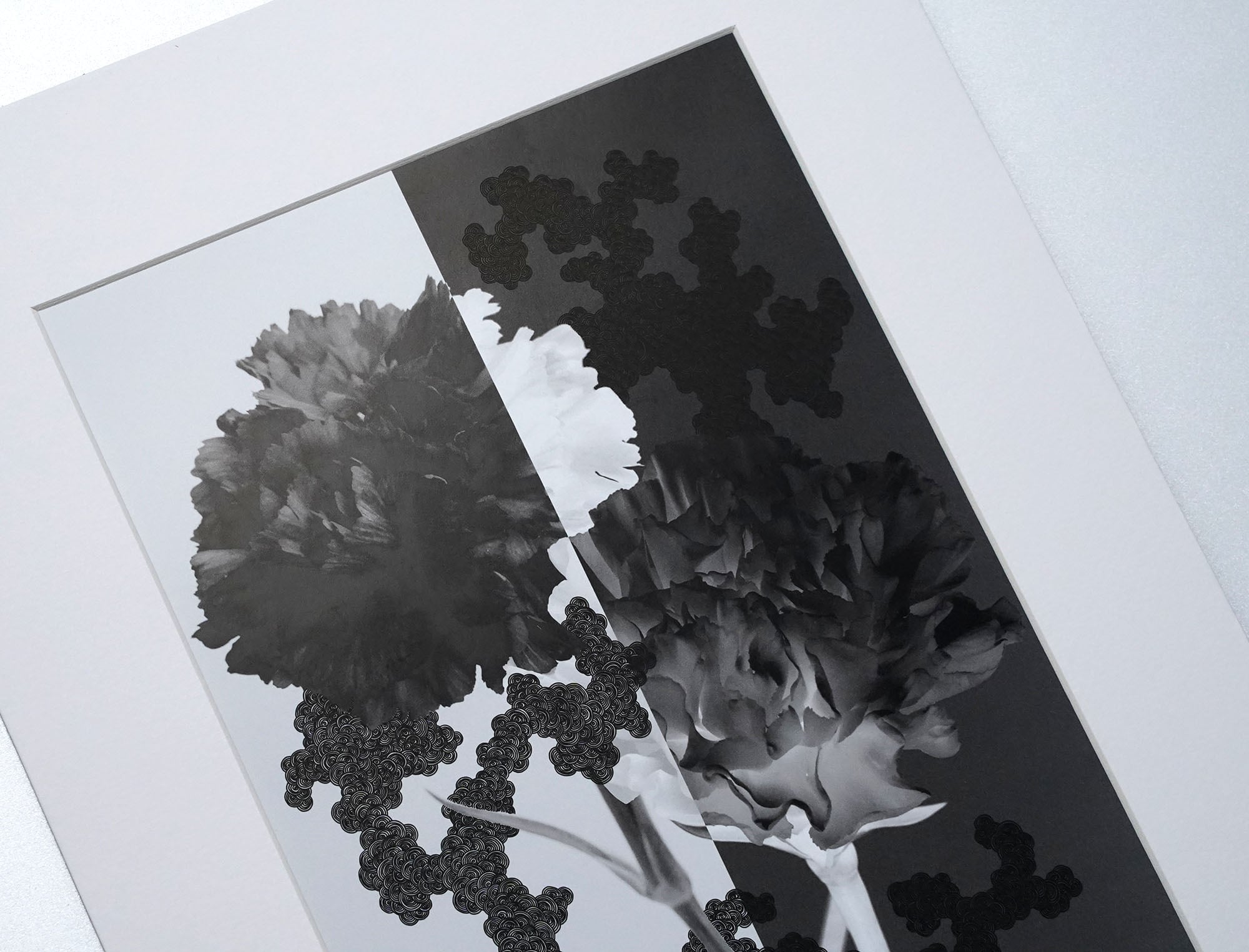このシリーズでは、花言葉にポジティブとネガティブ両方の意味を持つ花を選び、モノクロの写真に渦模様を手描きで描き加えています。