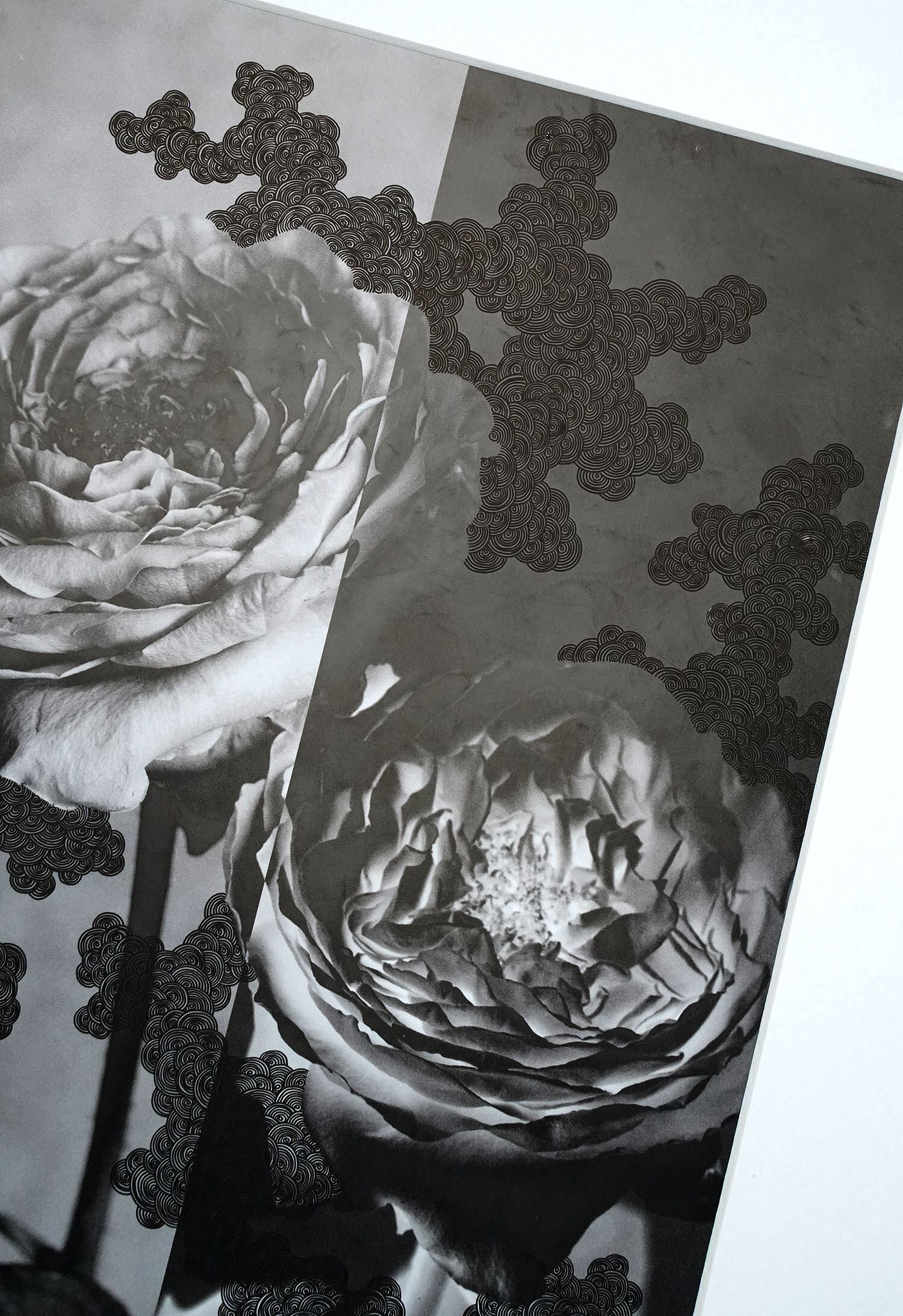 このシリーズでは、花言葉にポジティブとネガティブ両方の意味を持つ花を選び、モノクロの写真に渦模様を手描きで描き加えています。